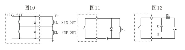 接點工作有兩種方式:直流方式和交流方式。在兩種方式下對負(fù)荷的性質(zhì)未能加限制,可接入阻性負(fù)荷或感性負(fù)荷,但是這兩種方式下使用上略有不同,如圖11所示,是直流方式的接線法,圖12是交流方式的接線法。