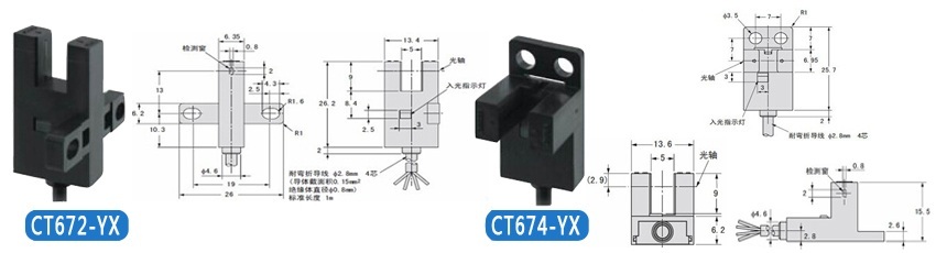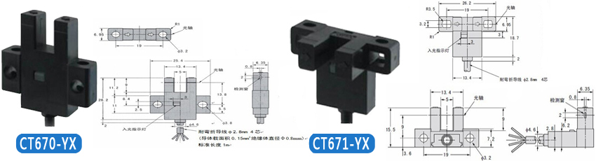 | KJT-CT671-YX 控制輸出 | 受光時紅色指示燈亮,NPN集電極無輸出;遮光時紅色指示燈滅,NPN集電極開路輸出DC5V--24V 、 100mA以下,殘留電壓0.5V以下(負荷電流100mA時)、殘留電壓0.3V以下(負荷電流40mA時) |